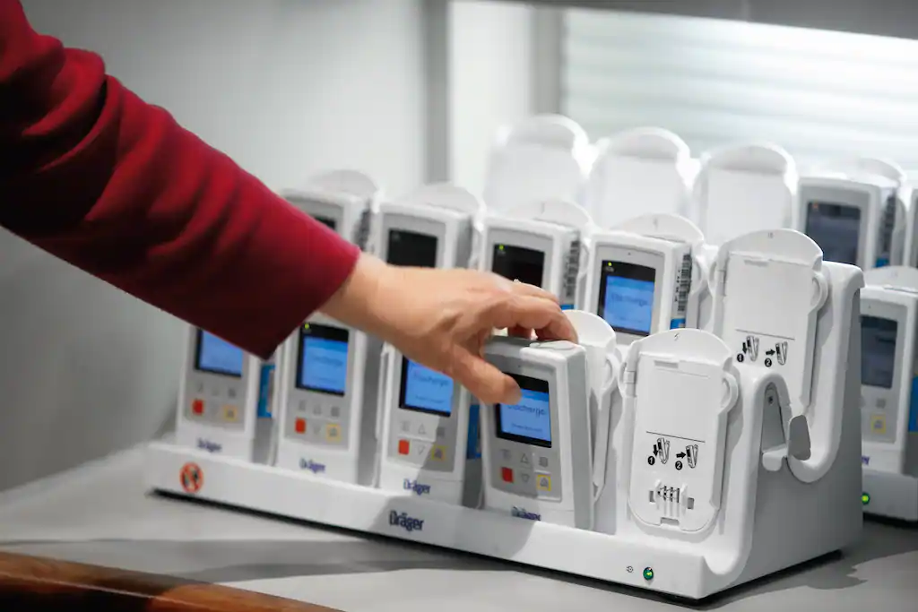 Infinity® M300 снабжен встроенной батареей, которую можно подзаряжать на прикроватном зарядном устройстве или с помощью специального централизованного зарядного устройства на общем посту наблюдения. Замена одноразовых батарей питания отходит в прошлое, что благоприятно сказывается на окружающей среде и бюджете больницы.